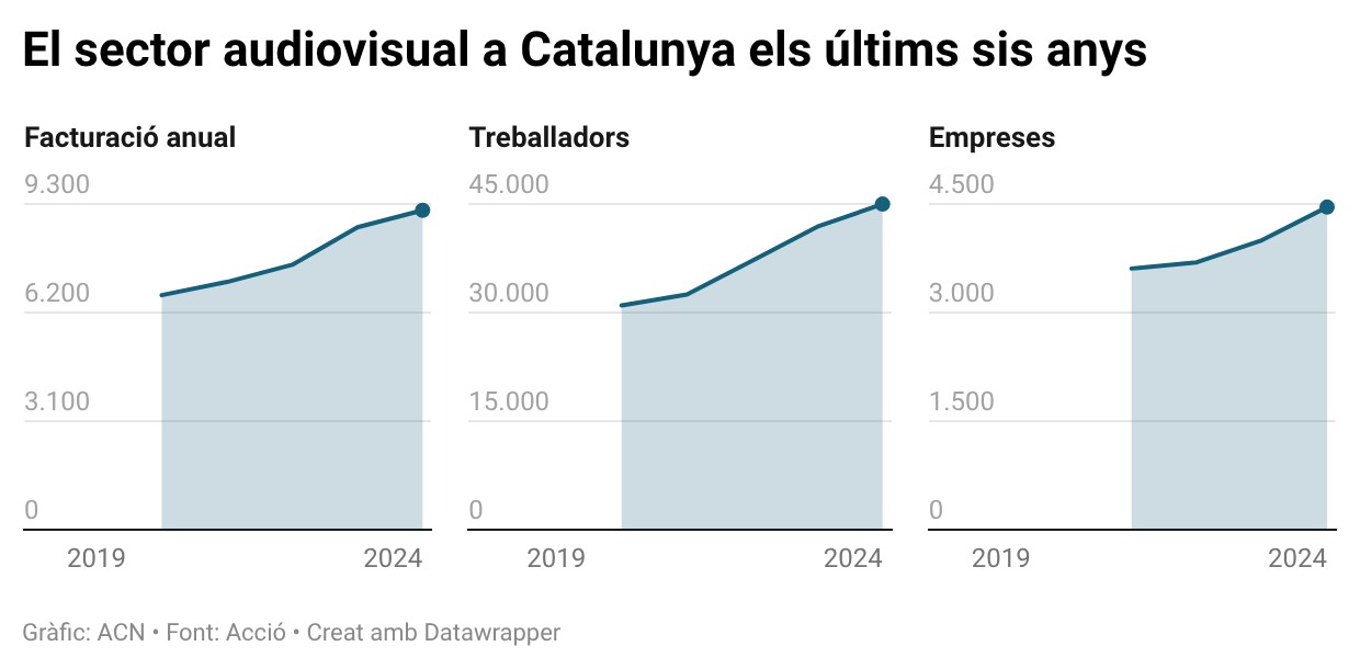 ACN Barcelona – El sector audiovisual a Catalunya va augmentar un 6% el volum de negoci durant el 2024, amb una facturació final de 9.120 milions d’euros, segons un estudi elaborat per ACCIÓ. Les dades demostren que el sector segueix a l’alça, i supera per primera vegada els 9.000 MEUR, però desaccelera el creixement respecte l’any anterior, en què la facturació havia crescut d’un 12%. El nombre d’empreses se situa en gairebé 4.500, un 7% més que el 2023, i ocupa prop de 45.000 persones, també un 8% més interanual. L’informe rebla que el sector equival al 3% del PIB català, el mateix percentatge que ocupava un any enrere.