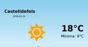 Predicció del temps per a Castelldefels: 24 de març de 2026 Avui, Castelldefels gaudirà d'un dia principalment assolellat amb temperatures agradables. La temperatura màxima prevista...