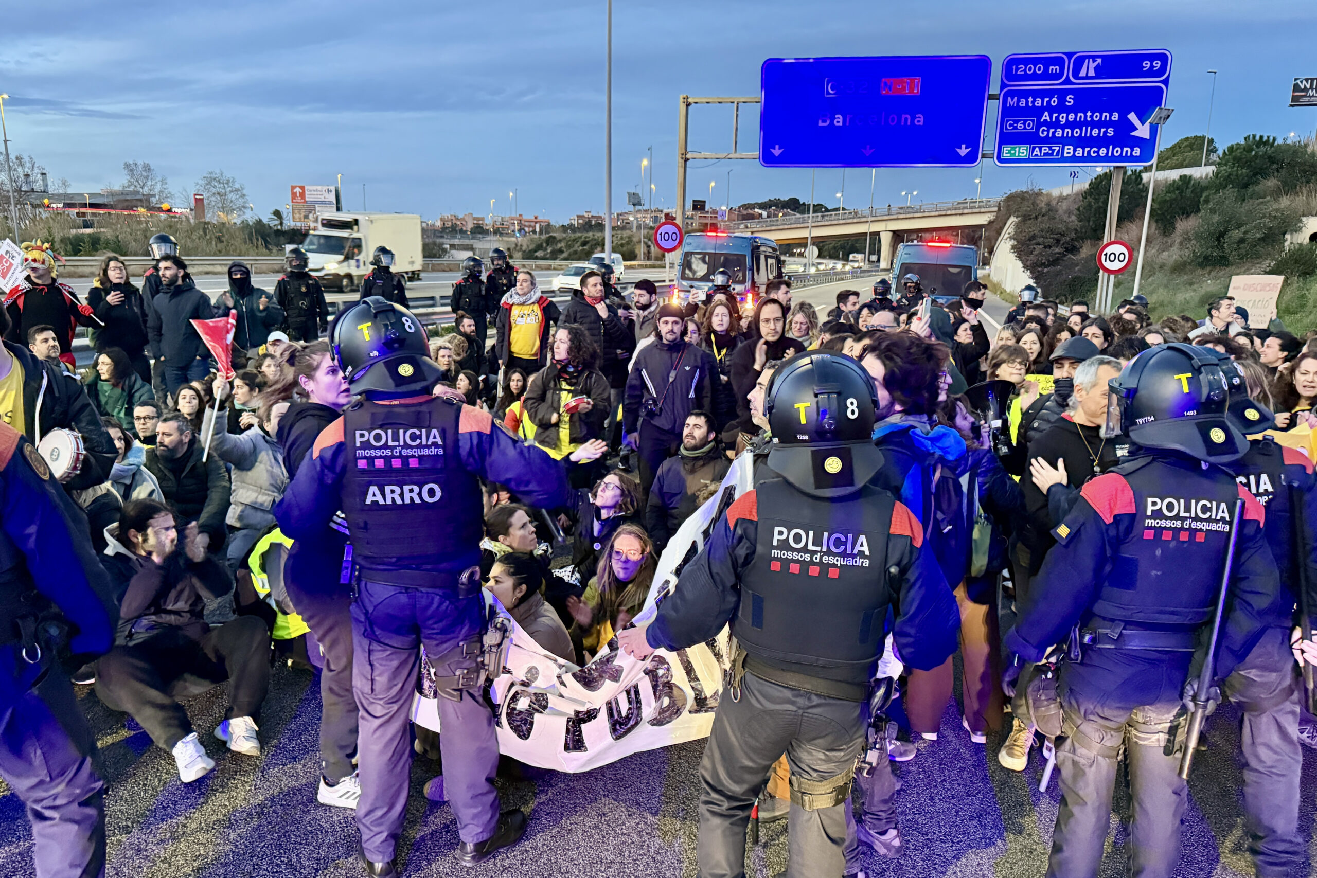 Els professors en vaga tallen la C-32 a Mataró en direcció Barcelona malgrat l’intent dels Mossos d’impedir-ho
