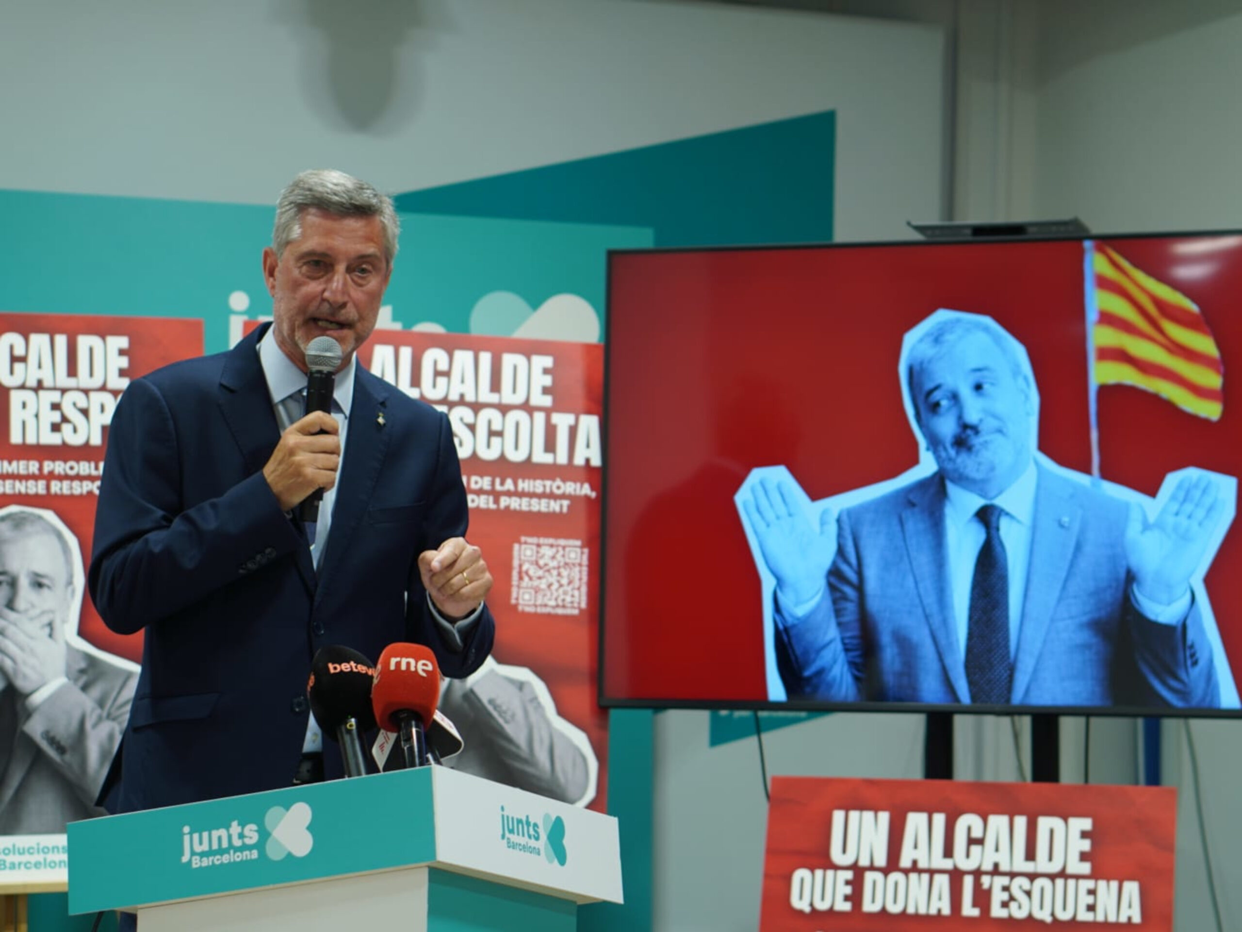 ACN Barcelona – El president del grup municipal de JuntsxBCN, Jordi Martí Galbis, ha denunciat que l’alcalde de Barcelona, Jaume Collboni, “dona l’esquena” a la ciutat: “Ni mira, ni escolta ni respon”, ha afirmat des de la seu del grup, des d’on ha presentat una campanya contra l’alcalde. Als cartells fets amb intel·ligència artificial hi apareix Collboni tapant-se la boca, els ulls i les orelles. Durant la roda de premsa d’aquest dijous, Martí ha explicat les propostes de JuntsxBCN per contrarestar un govern “sense ànima”. El grup vol que hi hagi més Mossos i 4.000 agents de la Guàrdia Urbana, 10.000 habitatges públics amb “calendari real” i desbloquejar la inversió privada, a més d’una “rebaixa real” d’impostos a famílies, classes mitjanes i autònoms.