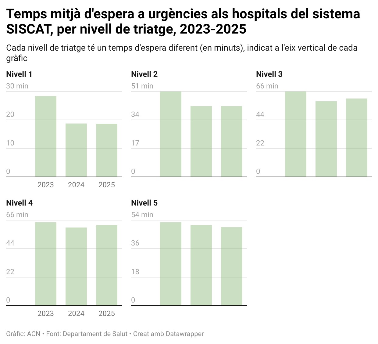 ACN Barcelona – L’activitat a les urgències dels hospitals del sistema públic de salut han continuat incrementant el 2025, amb 3.930.476 visites, un 2,1% més que el 2024, quan se’n van registrar 3.847.578 (3.750.576 el 2023), segons indica el Departament de Salut en una resposta del Govern al Parlament. El temps mitjà d’espera a urgències entre el triatge i la primera assistència mèdica en els pacients més greus ha estat, en el nivell 1, de 18,64 minuts, pràcticament igual que el 2024 (18,78) i molt menor que el 2023 (28,35) i, en el nivell 2, de 42,18 minuts (42,31 el 2024 i 50,91 el 2023). En els nivells 3 i 4, l’espera ha augmentat dos minuts i supera l’hora. Salut assegura que cap pacient es va esperar més de 12 hores abans de ser atès.